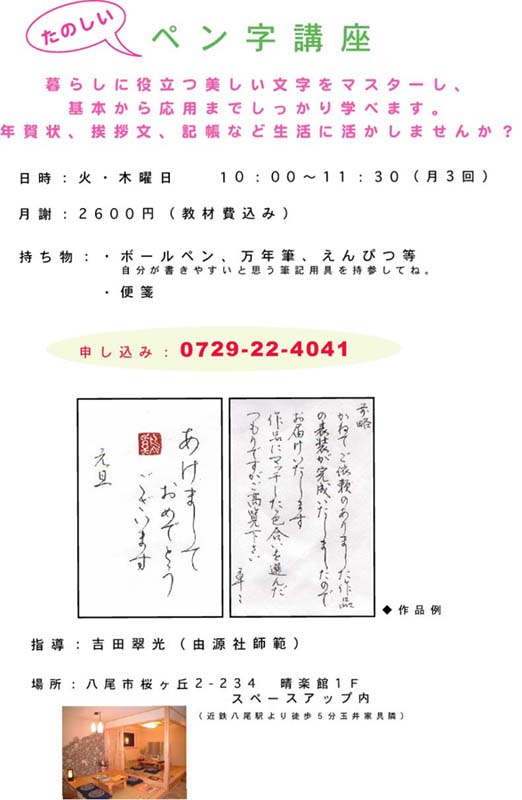 11月、12月の「暮らしの書」 年賀状 講座 パソコンや印刷に溢れていますが、手書きの年賀状は 愛情一杯で嬉しさもひときわですよね。 今年は筆の美しい年賀状を書いてみませんか? 教室、参加、随時募集中です。 お問い合わせ:06-6264-8733(翠光書院)